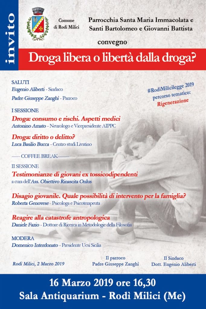 Il prossimo 16 Marzo alle ore 16,30 con il Convegno “Droga libera o libertà dalla droga?” s’inaugura la terza annualità del progetto #RodiMilicilegge.