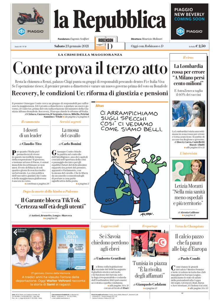 LA REPUBBLICA. Conte prova il terzo atto Resta la chiusura a Renzi, palazzo Chigi punta su gruppi di responsabili pescando dentro Fi e Italia Viva Se l’operazione riesce, il premier pronto a dimettersi e varare un nuovo governo prima del voto su Bonafede Recovery, le condizioni Ue: riforma di giustizia e pensioni