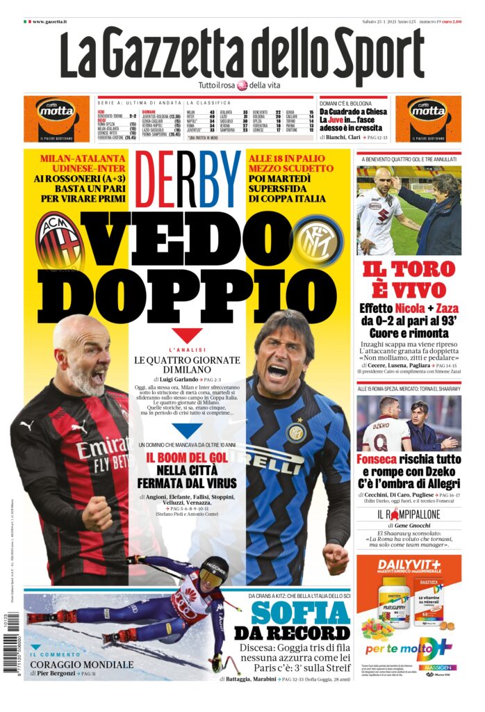 LA GAZZETTA DELLO SPORT. VEDO DOPPIO Le quattro giornate di Milano Oggi, alla stessa ora, Milan e Inter sfrecceranno sotto lo striscione di metà corsa, martedì si sfideranno sullo stesso campo in Coppa Italia. Le quattro giornate di Milano. Quelle storiche, si sa, erano cinque, ma in periodo di crisi tutto si comprime…