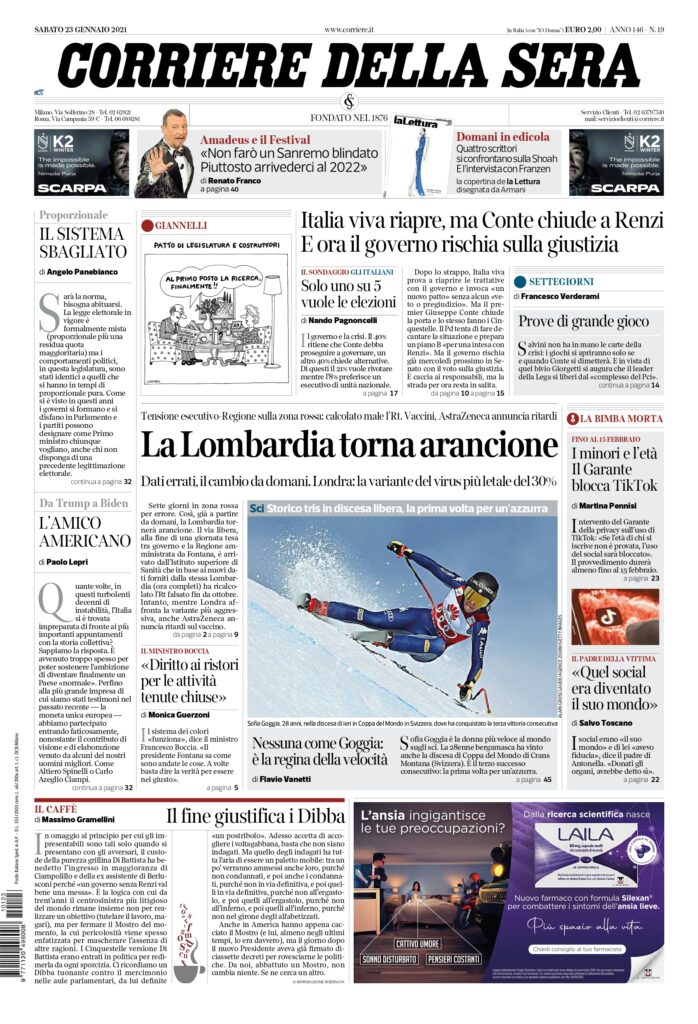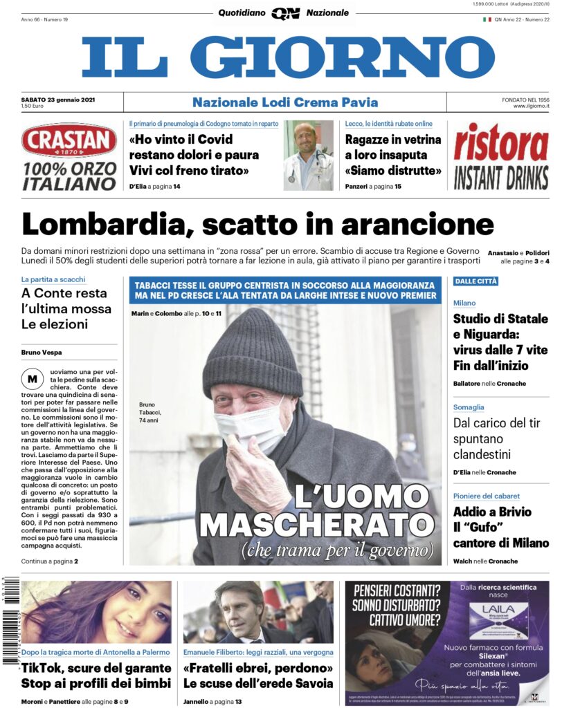 IL GIORNO. Lombardia, scatto in arancione Da domani minori restrizioni dopo una settimana in “zona rossa” per un errore. Scambio di accuse tra Regione e Governo. Lunedì il 50% degli studenti delle superiori potrà tornare a far lezione in aula, già attivato il piano per garantire i trasporti