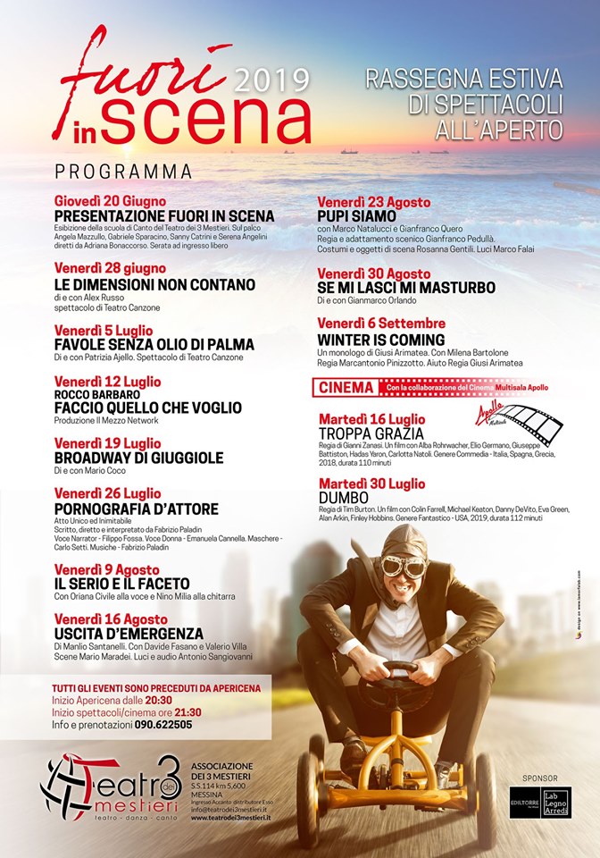 Non si fermano le attività al Teatro dei 3 Mestieri di Messina. Infatti, dopo la conclusione della stagione invernale, a breve partirà il cartellone “Fuori in Scena 2019”, con gli spettacoli estivi all’aperto.